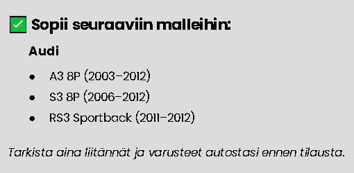 Laadukas päivitys vakio näytön tilalle. Mahdollistaa CarPlayn ja Android Auton käytön suoraan auton näytöllä. Tuotteen yhteensopivuus näkyy kuvista.