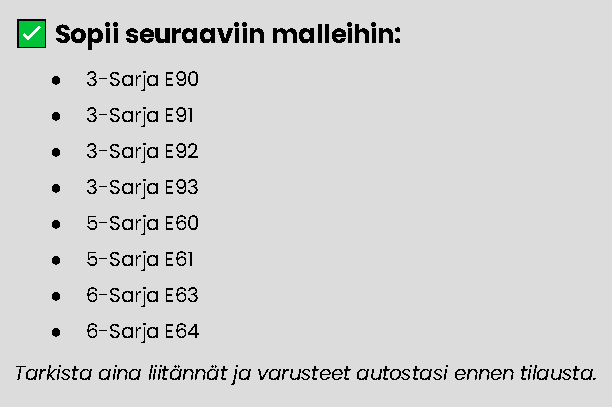 Pääsääntöisesti tuotteeemme sopivat suoraan vanhan osan tilalle ilman koodauksia. Muistathän varmistaa sopivuus autoosi aina tuotteen kuvauksesta.