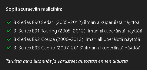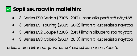 Laadukas päivitys BMW:n vakio näytön tilalle. Mahdollistaa CarPlayn ja Android Auton käytön suoraan auton näytöllä. Tuotteen yhteensopivuus näkyy kuvista.
