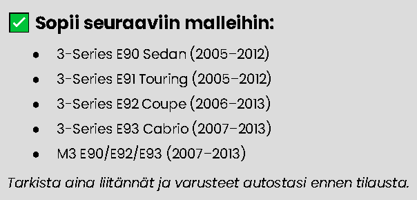 Tyylikäs ja laadukas päivitys BMW:n sisustaan. Sopii suoraan lähes kaikkiin E9X-sarjan malleihin ja tuo ajotuntumaan uuden ilmeen. Tuotteen yhteensopivuus näkyy kuvista.