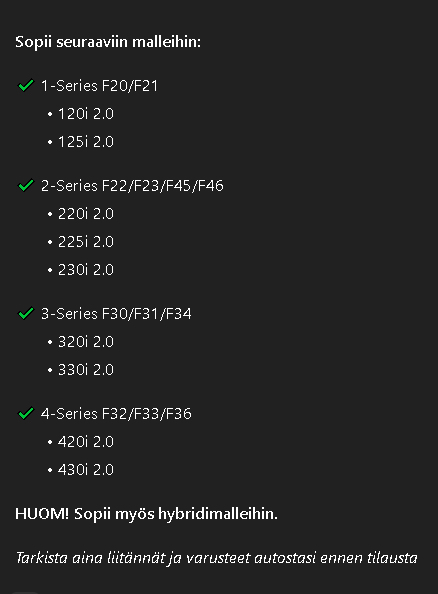 Erinomainen päivitys moottorin suorituskyvylle. Parantaa virtauskykyä ja tuottaa enemmän ääntä. Tuotteen yhteensopivuus näkyy kuvista.