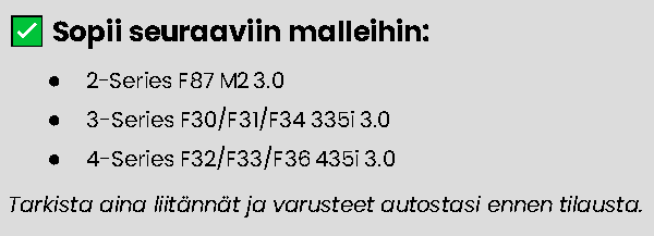 Tehokas päivitys moottorille! Vapaavirtasuodatin parantaa ilmanvirtausta, lisää moottorin tehoa ja tuo sporttisemman äänimaailman. Tuotteen yhteensopivuus näkyy kuvista.