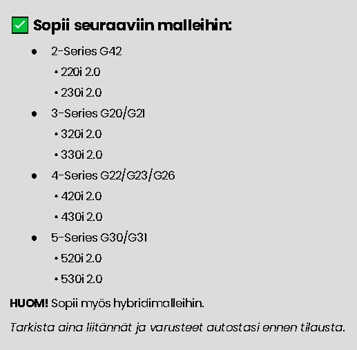 Pääsääntöisesti tuotteeemme sopivat suoraan vanhan osan tilalle ilman koodauksia. Muistathän varmistaa sopivuus autoosi aina tuotteen kuvauksesta.